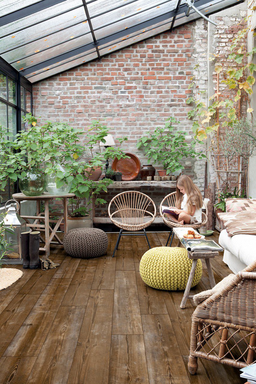 • LVT parkett Quick-Step Bloom Sundown Pine paigaldatud talveaia põrandale. Potitaimed, trrassimööbel, laps istub toolil ja loeb raamatut.